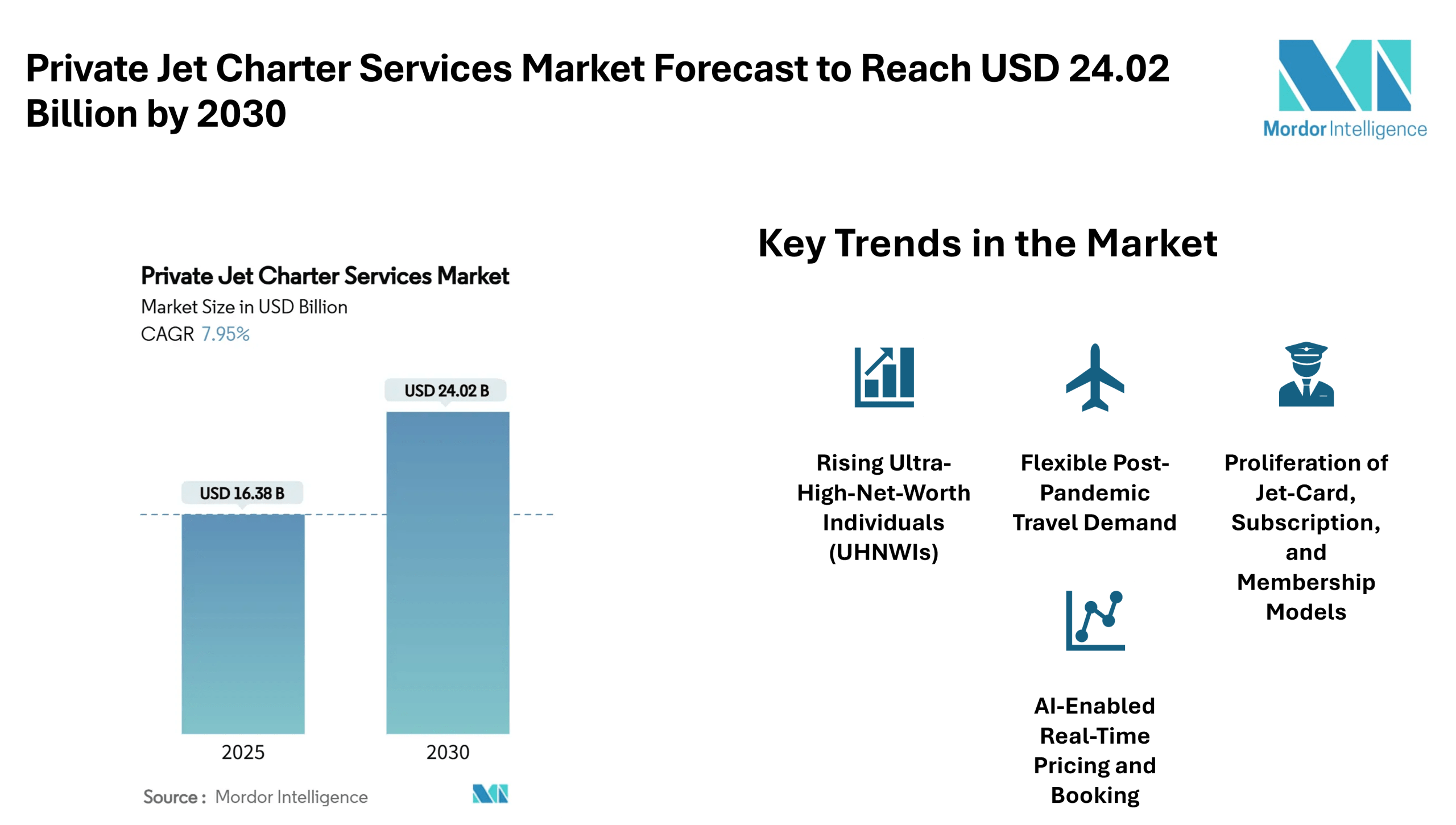 According to a recent analysis by Mordor Intelligence, the private jet charter services market reached USD 16.38 billion in 2025 and is forecasted to reach USD 24.02 billion by 2030, securing a 7.95% CAGR that signals durable expansion across global business and leisure travel. This forecast underscores sustained demand across both corporate and leisure travel segments, driven by increasing ultra-high-net-worth individuals (UHNWIs), flexible travel preferences, and advanced digital platforms.