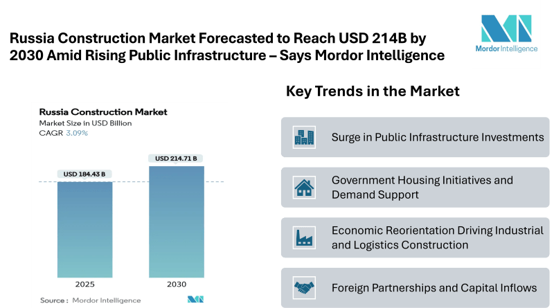 According to Mordor Intelligence, the Russia construction market size stands at USD 184.43 billion in 2025 and is forecast to reach USD 214.71 billion by 2030, translating into a 3.09% CAGR. This growth is driven by sustained public infrastructure spending, housing initiatives, industrial expansion, and reconstruction efforts in newly integrated and war-affected territories. Despite high mortgage rates impacting urban apartment demand, Russia continues to record strong individual housing completions, underpinned by national-project funding and the expansion of logistics and industrial facilities.